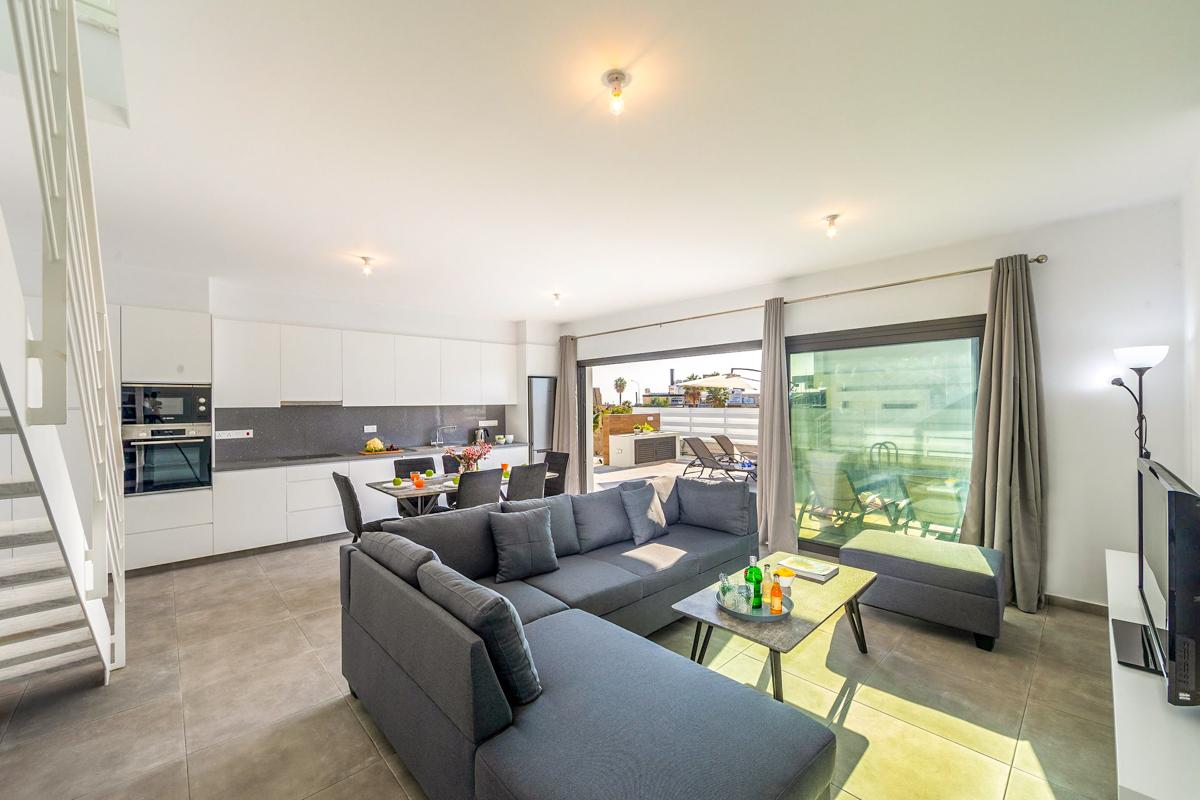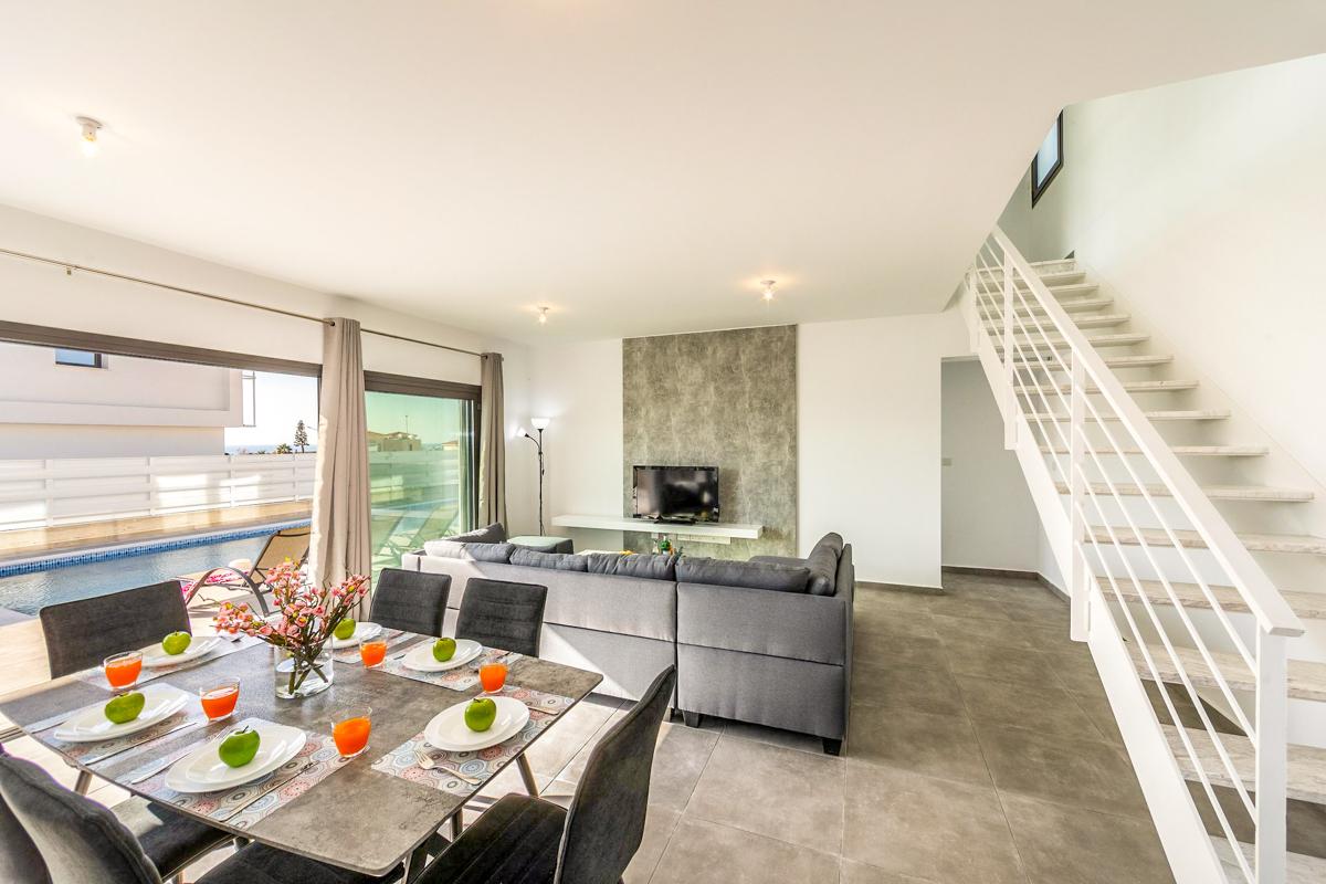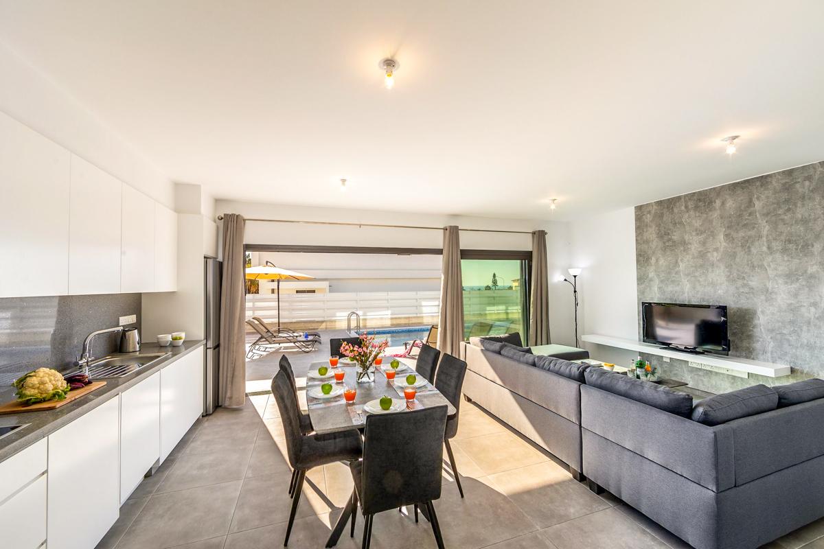 Villa Thora features a clean, open-plan design for a relaxing stay in Cyprus. There is a smart living, dining and kitchen area on the ground floor with comfortable modern furniture, as well as a flat screen TV with streaming capabilities – perfect for movie nights or keeping the kids entertained indoors when it’s too hot outside.