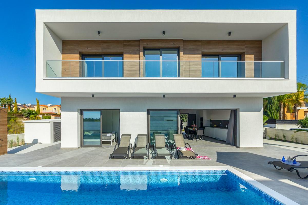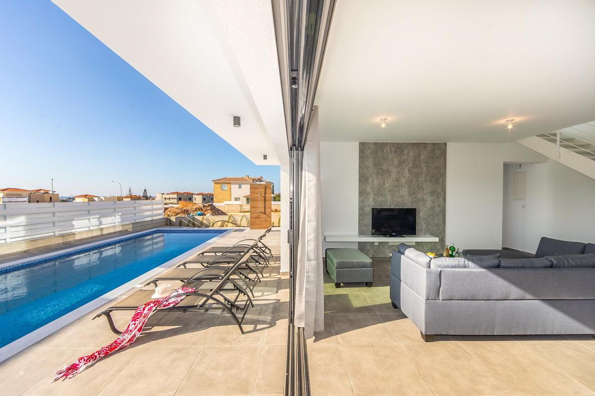 A modern open-plan villa with 3 bedrooms, sun terrace and pool, close to Coral Bay in Paphos, Cyprus.